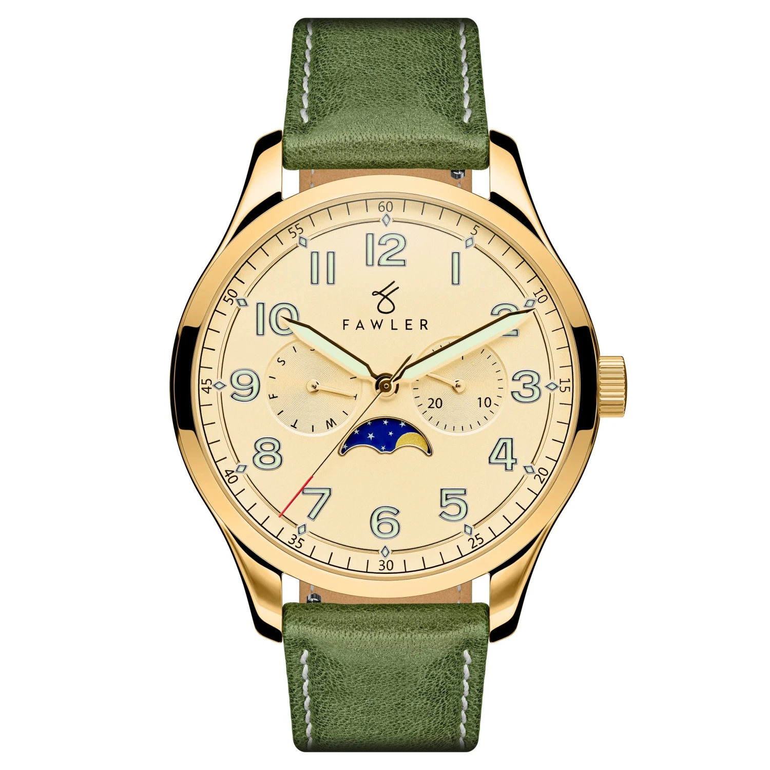 Aiguilles et chiffres qui brillent dans le noir vous permettant de lire l’heure même en pleine obscurité et sous-cadran à phases de lune pour un look intemporel.