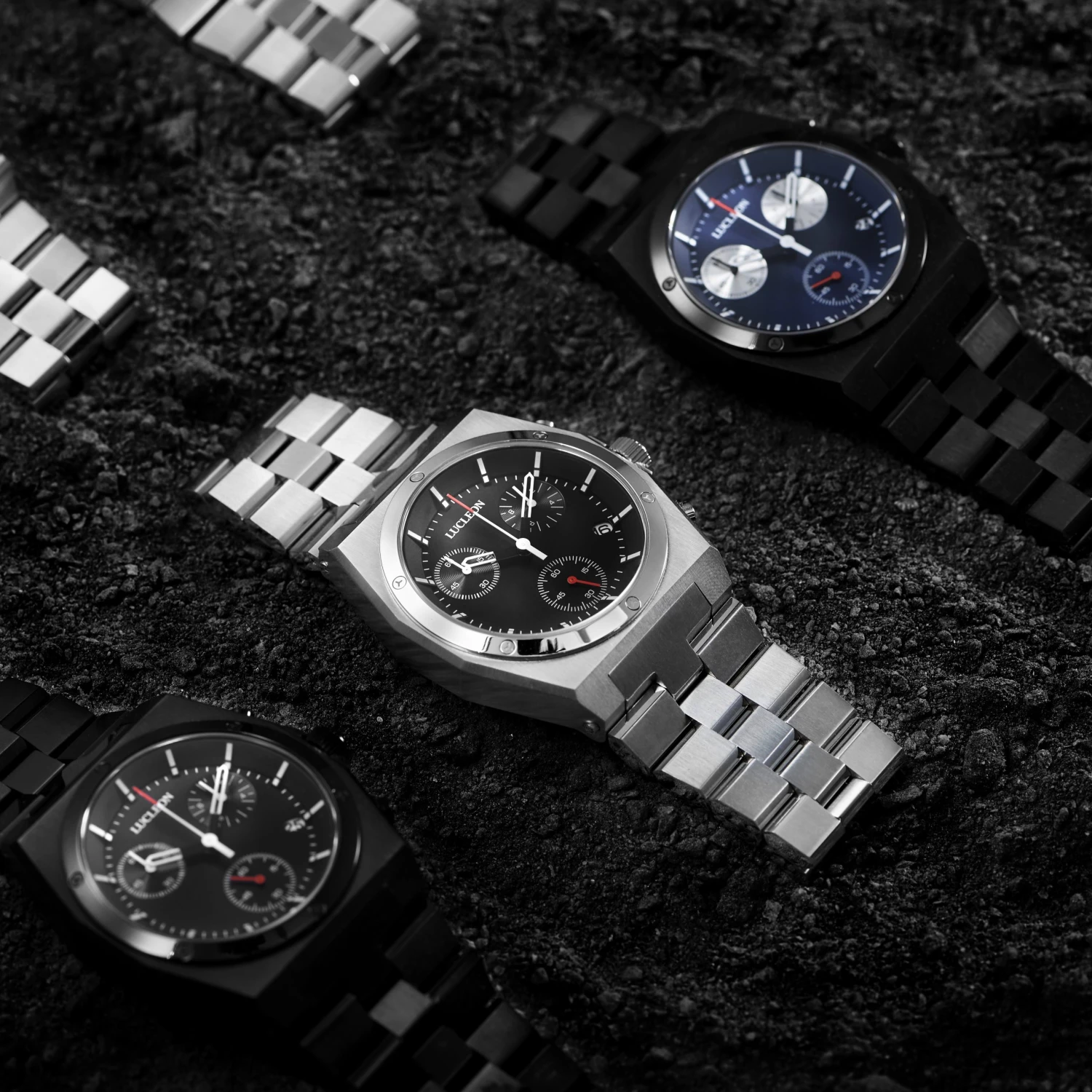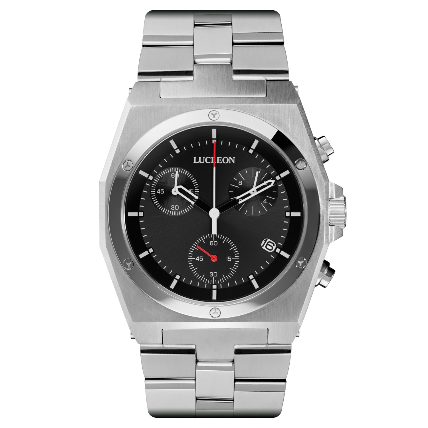 Cette montre robuste pour homme a été fabriquée en acier inoxydable 316L et est équipée d’un fermoir à boucle déployante sécurisée. Son cadran noir abrite 3 sous-cadrans / chronomètre et une fenêtre d’affichage de la date.