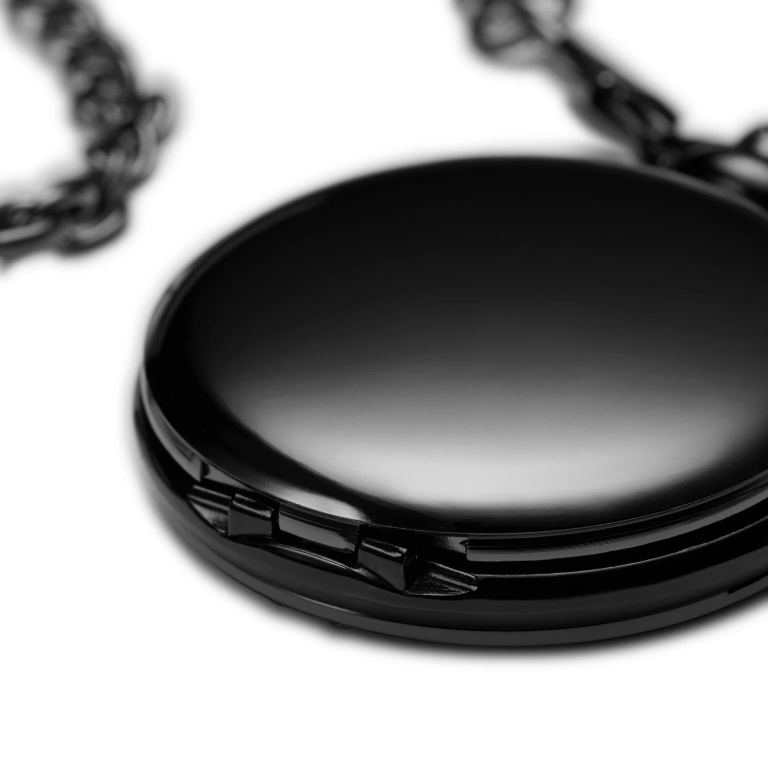Cette montre de poche noire est livrée avec une chaîne pour passant de ceinture assortie. Glissez simplement l’attache sur votre pantalon ou votre ceinture – aucune veste ou manteau requis.