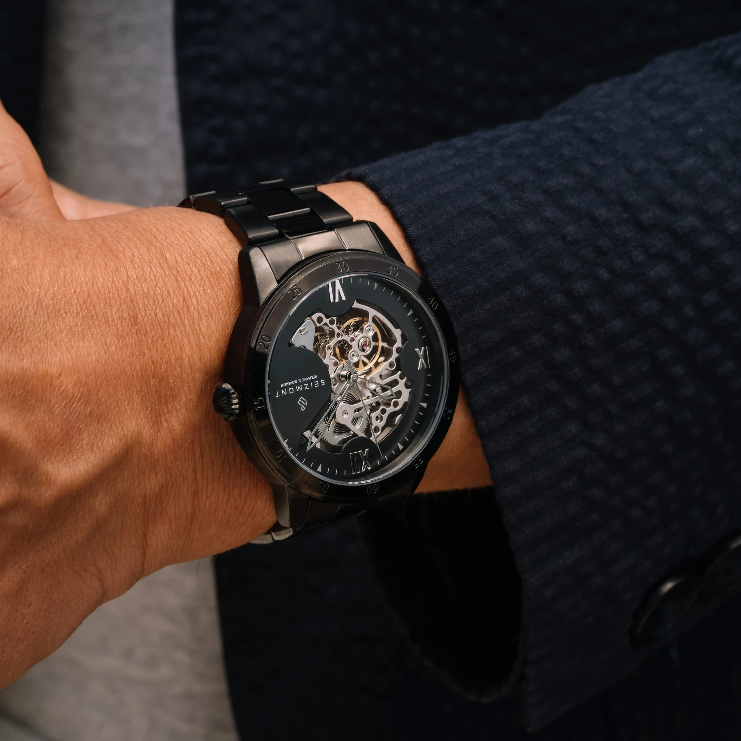 Son bracelet en métal noir se referme en toute sécurité à l’aide d’une boucle déployante. Ce design est complété par un cadran noir décoré de chiffres romains argentés.