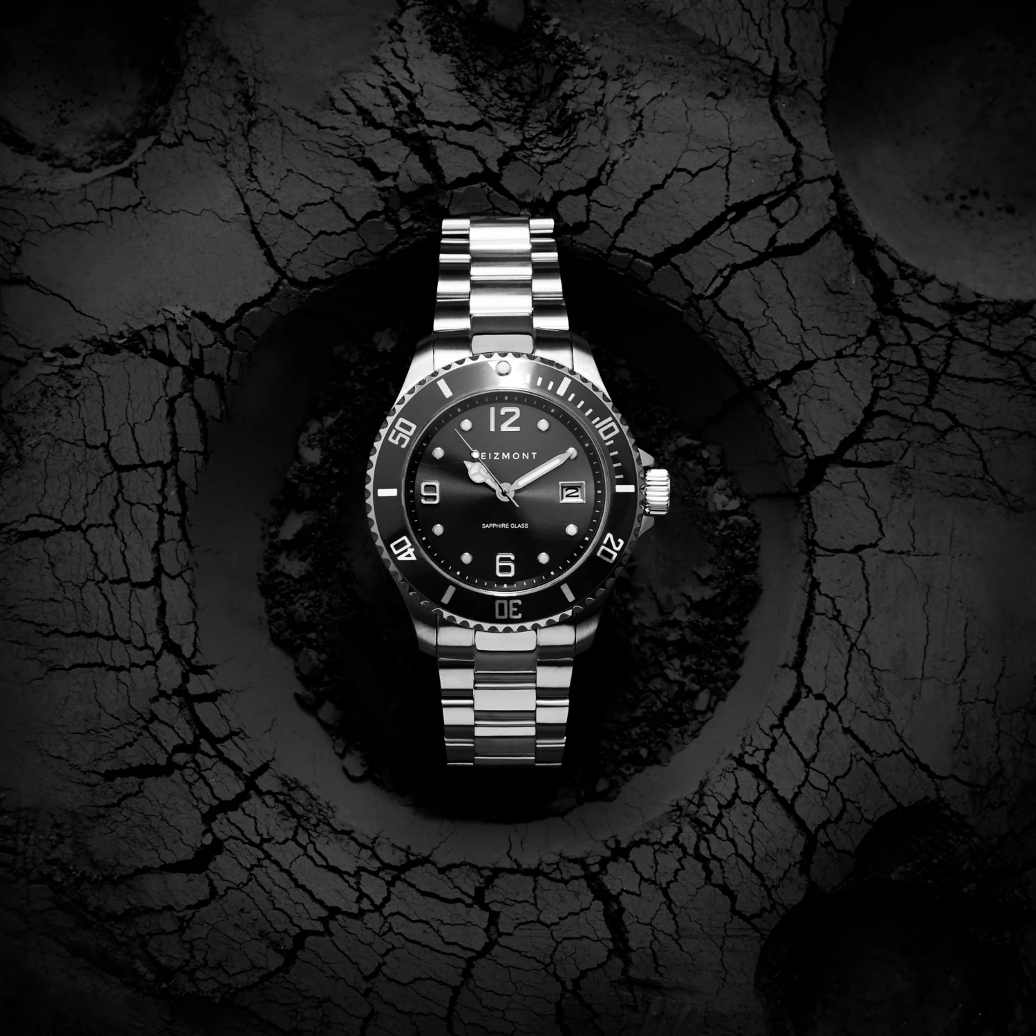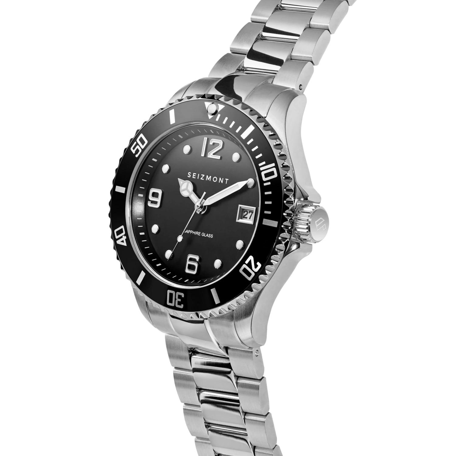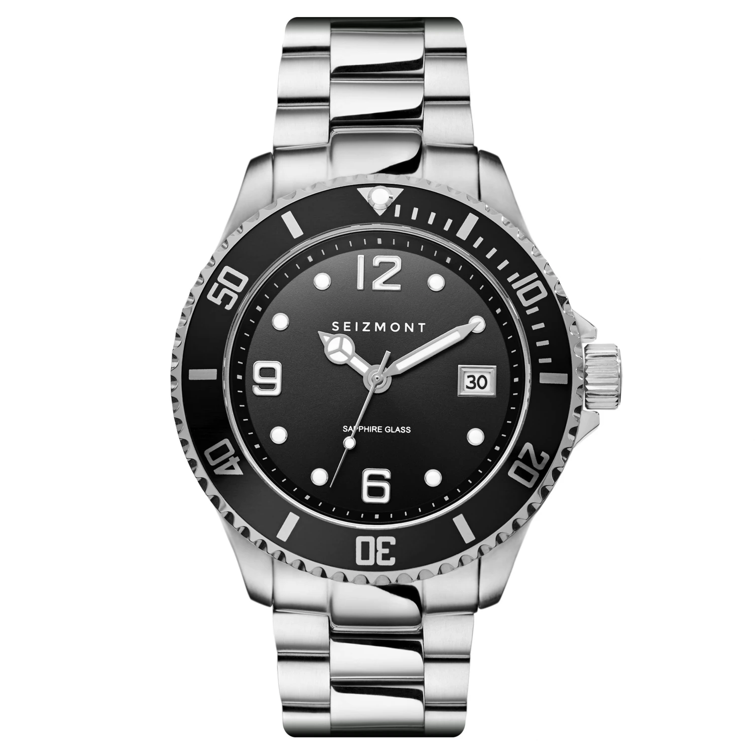 Fabriquée en acier inoxydable de qualité chirurgicale avec un verre saphir et une lunette noire graduée. Le cadran noir comporte des aiguilles et des index luminescents et une fenêtre de date à 3 heures.