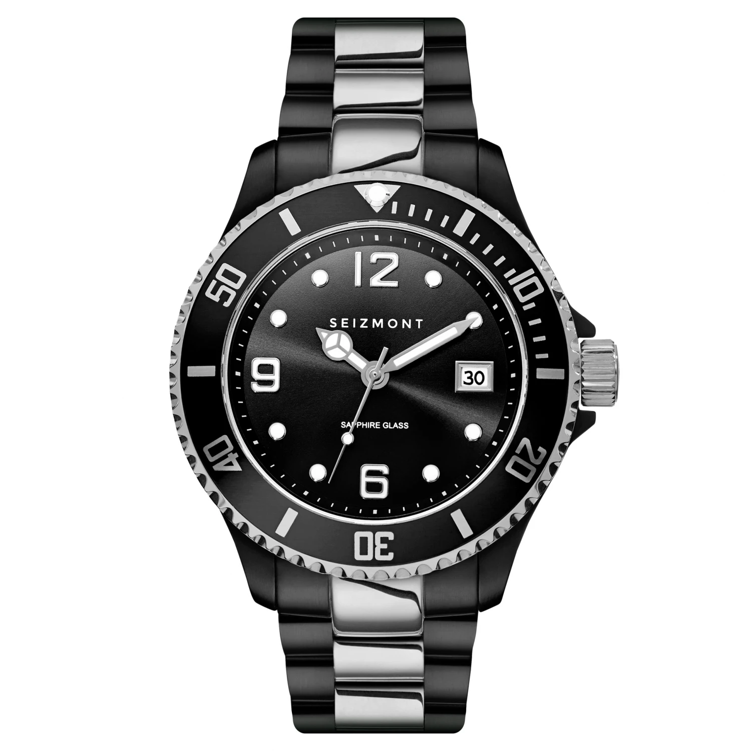 Le cadran noir saisissant comporte des aiguilles et des marqueurs luminescents et une fenêtre de date à 3 heures. Une lunette graduée assortie complète le design noir et argenté.