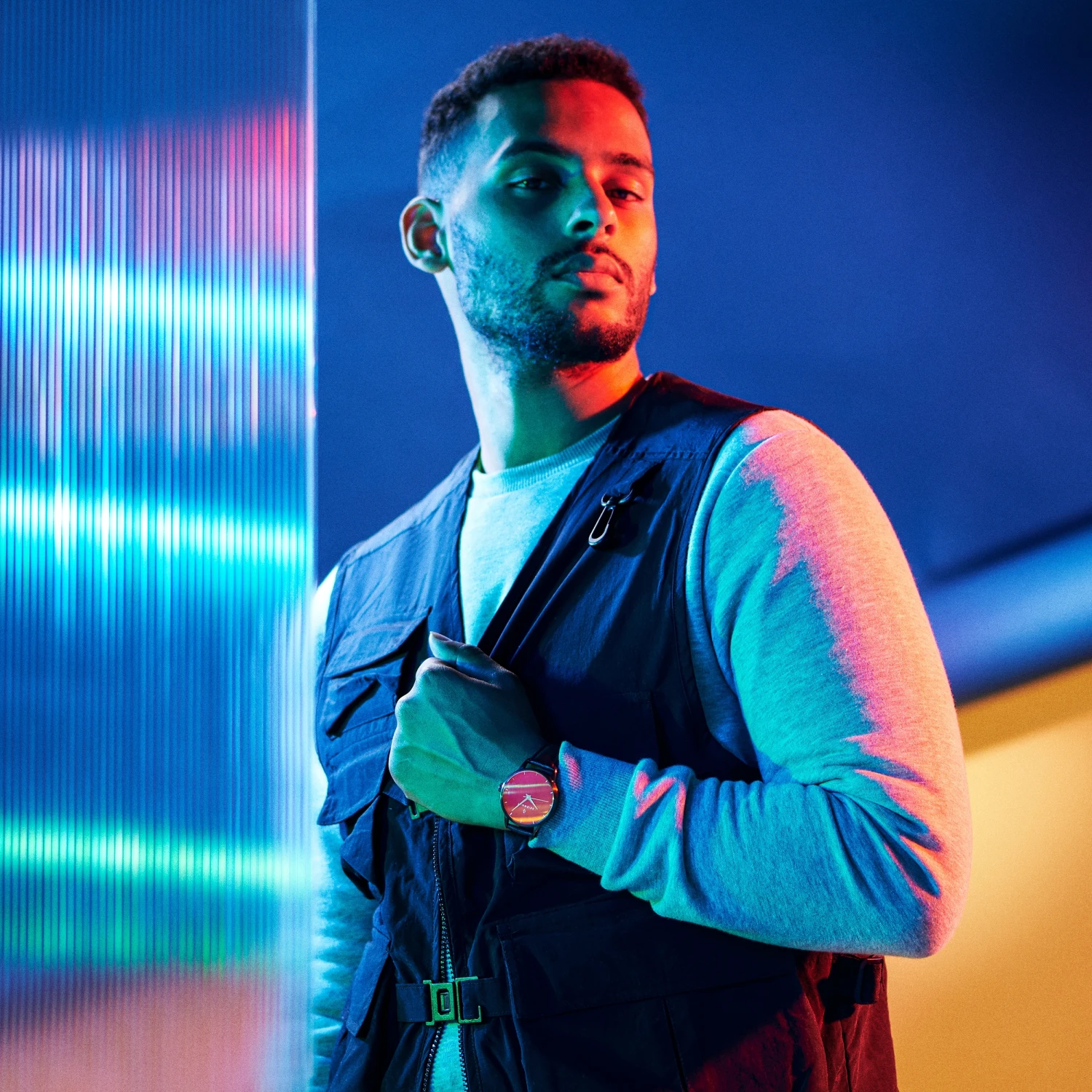 Le verre bombé de cette montre pour homme présente de légers reflets jaunes et rouges pour lui donner une touche de couleur aussi subtile qu’élégante.