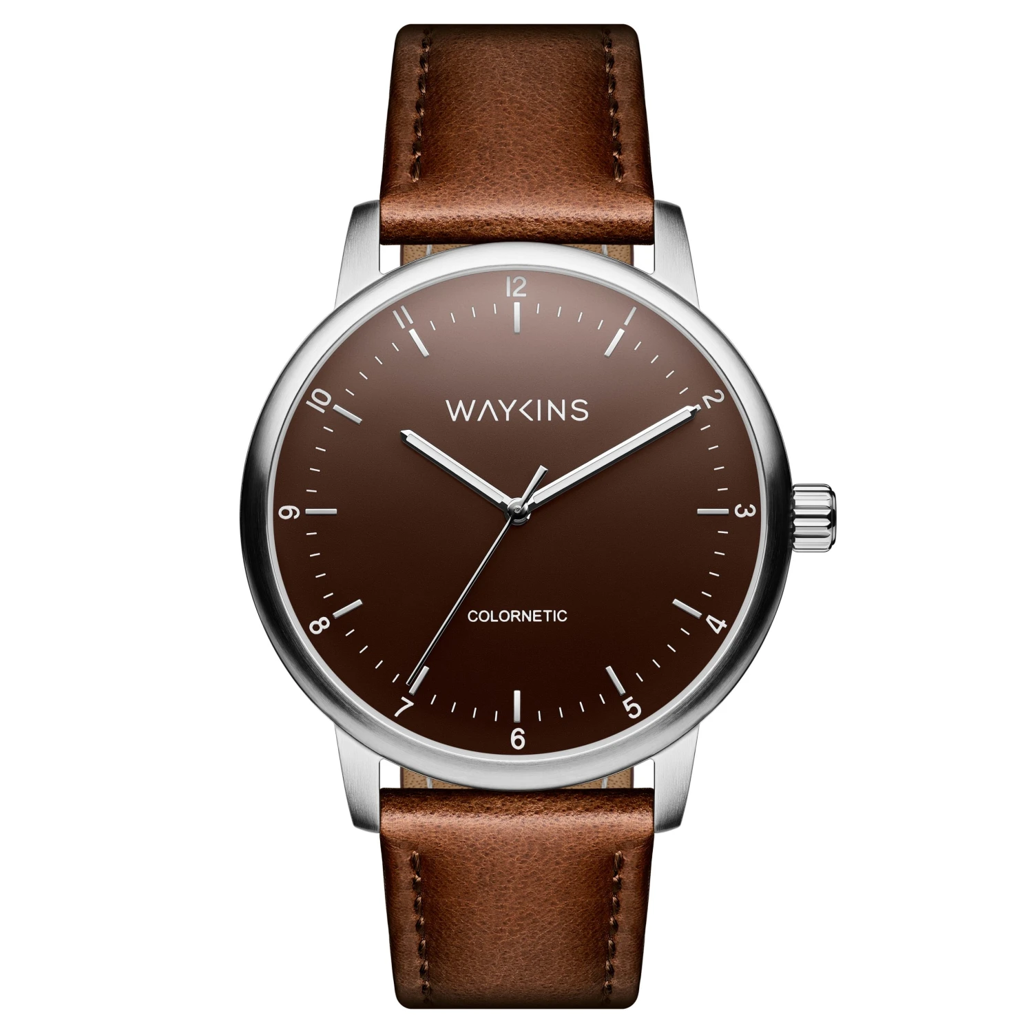Attachée fermement à votre poignet avec un bracelet interchangeable en cuir marron véritable. Changez-le en un tour de main avec vos doigts pour seuls outils.